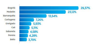 1. En Bogotá (29,37%) y Medellín (23,12%) se encuentra la mayor disponibilidad de inmuebles nuevos y usados en venta como se puede ver en el siguiente gráfico. Además, el tipo de inmueble que más se ofrece es apartamentos, con el 56,58%, solo el 18,73% casas, y el 24,69% restante correspondió a lotes, bodegas y oficinas. En el segundo trimestre del año, Pereira aparece en el ranking por encima de Bello (Gráfico 1).