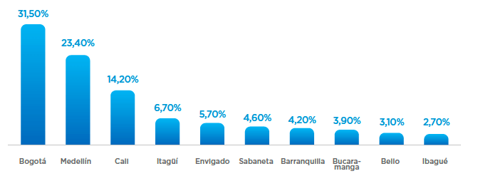 7. Con respecto a la demanda de inmuebles, con un 69,1% de participación, Bogotá, Medellín y Cali siguen siendo las ciudades en las que más se buscan inmuebles para comprar o arrendar en el país. Sin embargo, es importante mencionar que el interés en Bogotá ha disminuido en el segundo trimestre del año. Por su parte, Medellín, Itagüí, Envigado, Ibagué, Barranquilla, Bello y Sabaneta han tomado mayor relevancia (Gráfico 3).