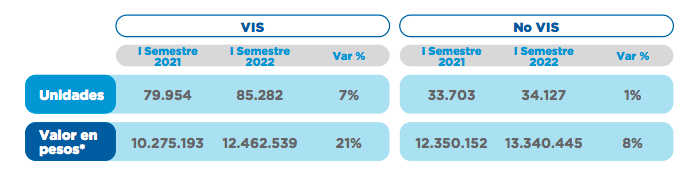 8. En Colombia aumentó 14% el valor monetario de la venta en proyectos de vivienda nueva a cierre del segundo trimestre de 2022, comparado con el año anterior. Para la vivienda VIS, el incrementó fue de 21% y en No VIS de 8%. El valor de las unidades vendidas, a cierre del segundo trimestre, en términos monetarios equivale a $25,8 billones. En términos de unidades, en proyectos hubo un aumento del 5%, con 119.409 unidades en general; para vivienda VIS, fue de 7% y en No VIS, de 1%, demostrando una caída en las viviendas No VIS. (Gráfico 4).